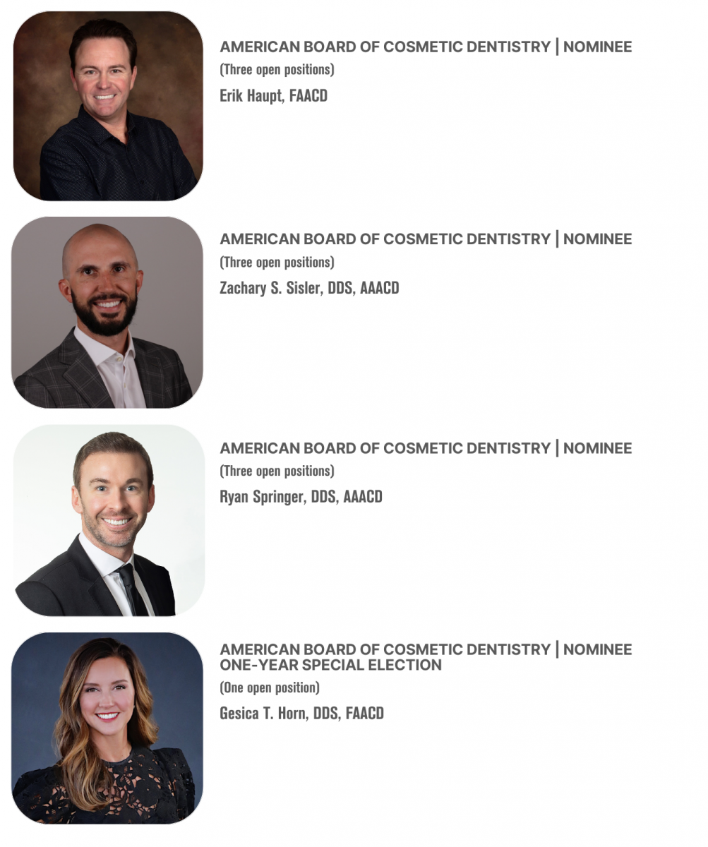 Candidate MaterialsThe committee is responsible for seeking out and encouraging future leaders for the Academy and for presenting a recommended slate of nominees to the AACD membership for the Board of Directors and the American Board of Cosmetic Dentistry. Candidates run from the floor and are not vetted by the NALDC.