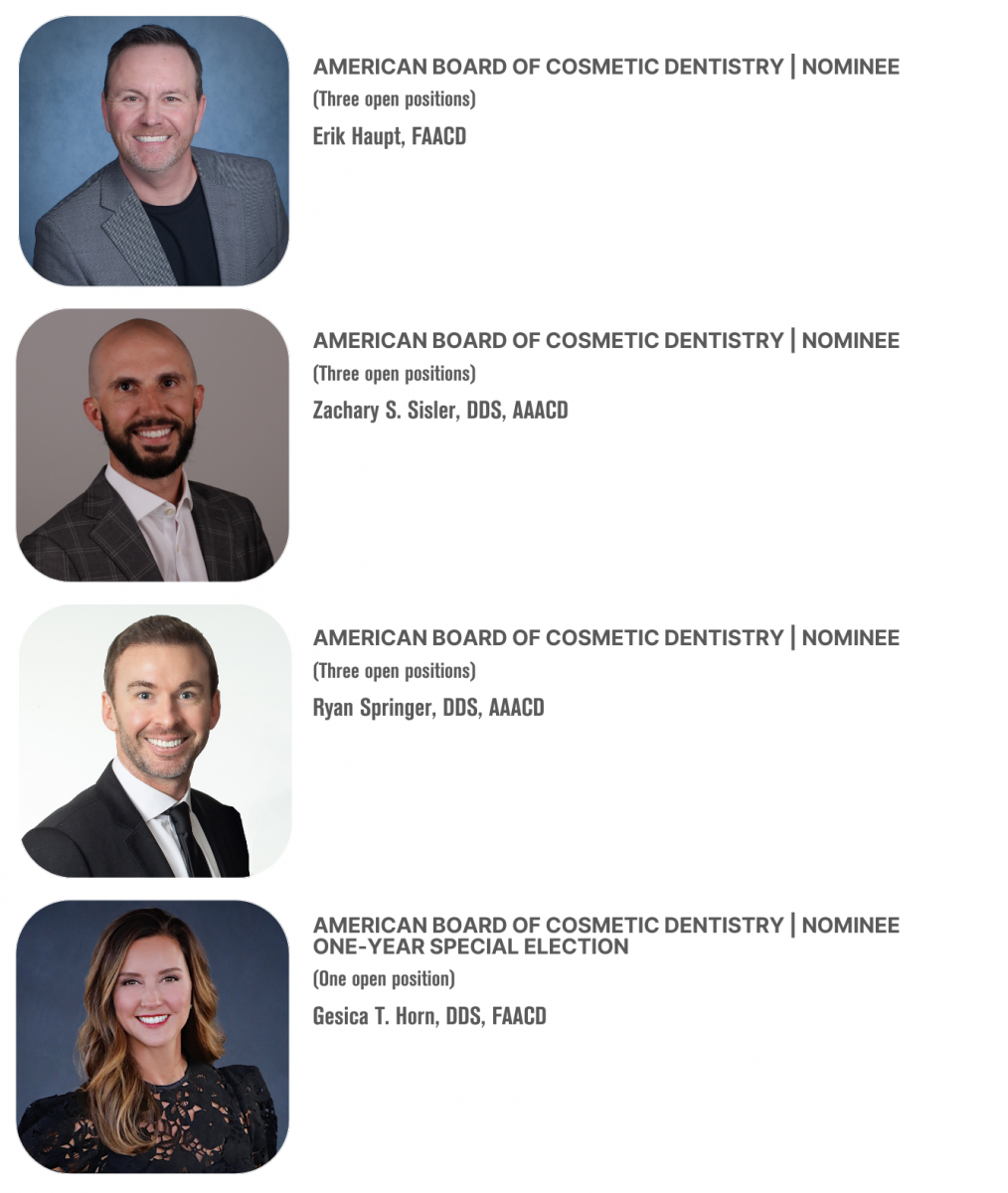 The committee is responsible for seeking out and encouraging future leaders for the Academy and for presenting a recommended slate of nominees to the AACD membership for the Board of Directors and the American Board of Cosmetic Dentistry. Candidates run from the floor and are not vetted by the NALDC.