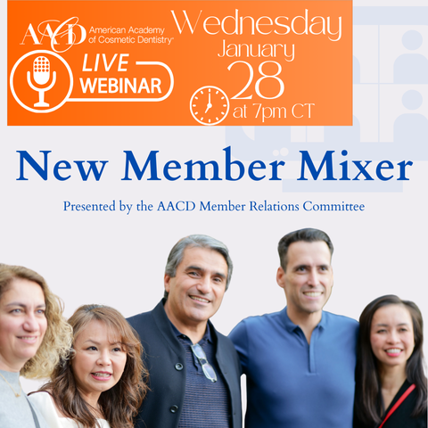 Are you a new AACD member? Join our quarterly New Member Mixers and enjoy casual, virtual opportunities to connect with fellow members, explore AACD programs, and discover how to get the most from your membership. These sessions will help you navigate member benefits, explore new opportunities, and chart the next steps in your professional journey. You’ll have the chance to ask questions, network with other new members, and engage with established AACD members who can offer insights into the value and impact of membership. To learn more, please contact Davis Brinkmann at davisb@aacd.com.